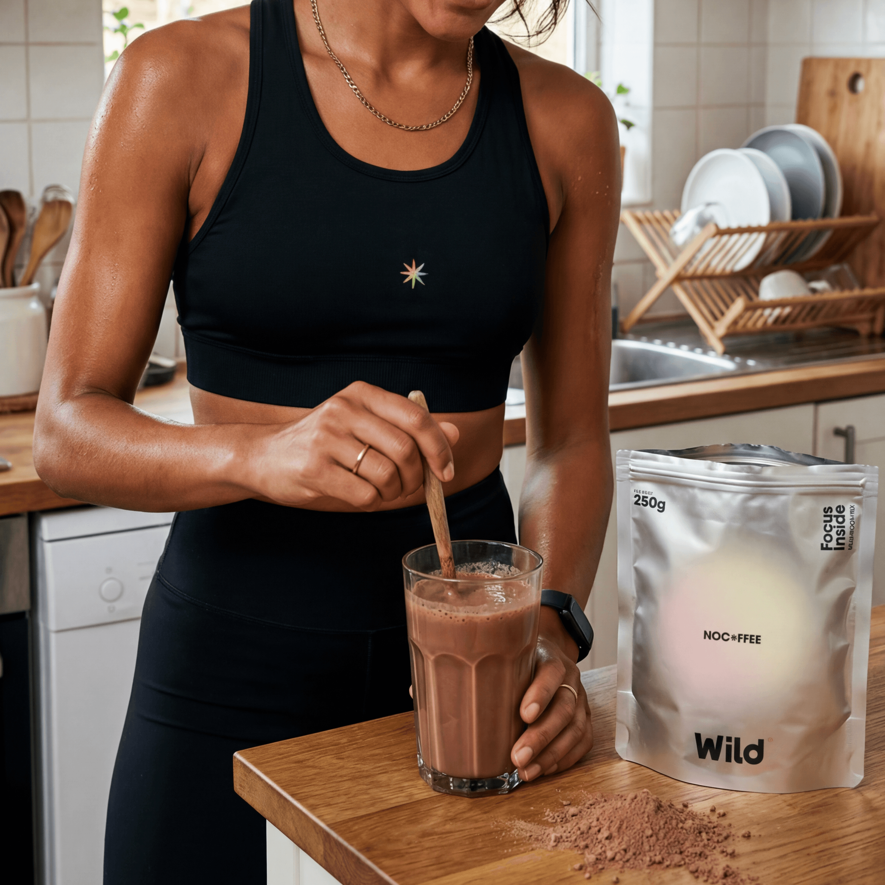 Powdered cocoa blend with functional mushrooms and adaptogens to replace coffee. Activates the mind without jitters or crashes and is ready in 10 seconds: 1 tablespoon in water or plant-based milk. Rounded cocoa flavor, vegan and dairy-free. Ideal for work, study, or a light pre-workout.